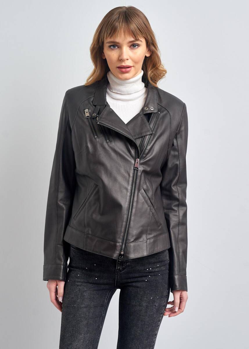 Clara Women's Genuine Leather Jacket Biker Leather Jacket 100% Genuine Leather, Adjustable Zipper, Short, Sport Leather Jacket, Pierre Cardin Leather Jacket Pierre Cardin Autumn-Winter