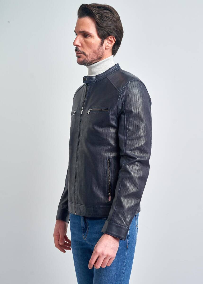 Erkek Mavi Motorcu Kısa Hakiki Deri Ceket